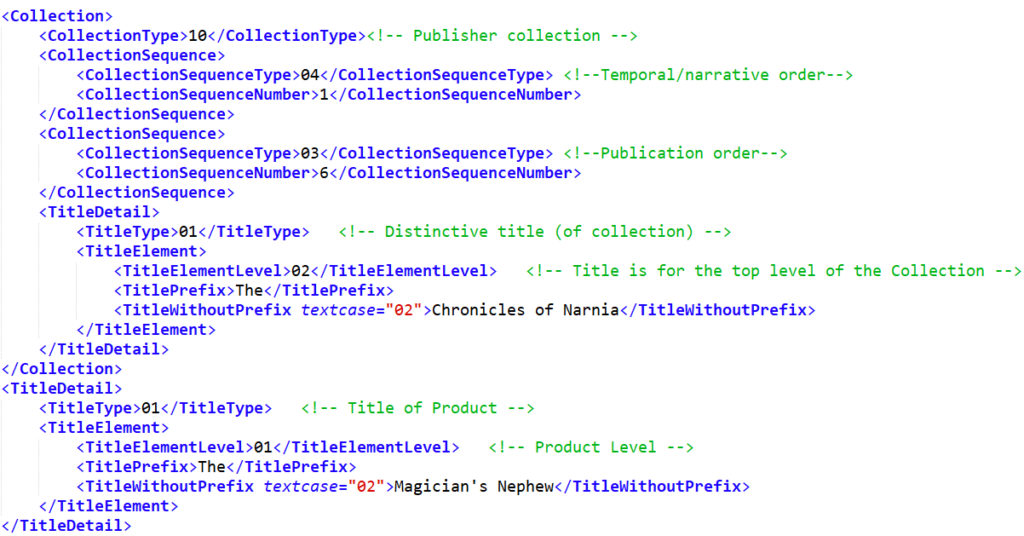 For more information and rules on how to create product records in ONIX for titles in a collection, please consult the ONIX application note How to describe sets, series and multiple-item products in ONIX 3, compiled by EDItEUR, BISG, and BIC.